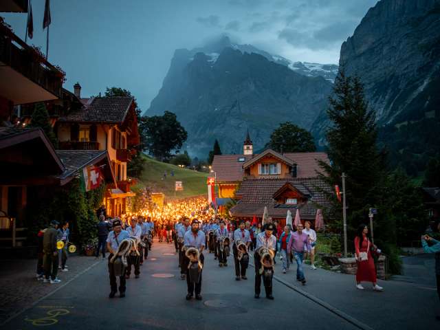 Der alljährliche Fackel- und Trychlerumzug beginnt um 21.00 Uhr. Die Besammlung ist um 20.30 bei der Dorfkirche, von der man dann durch das Dorf bis zum Nordwandplatz beim Eiger+ marschiert.