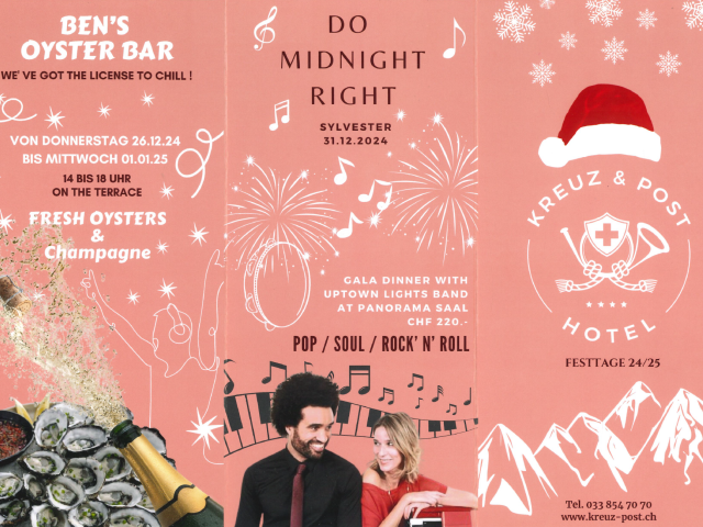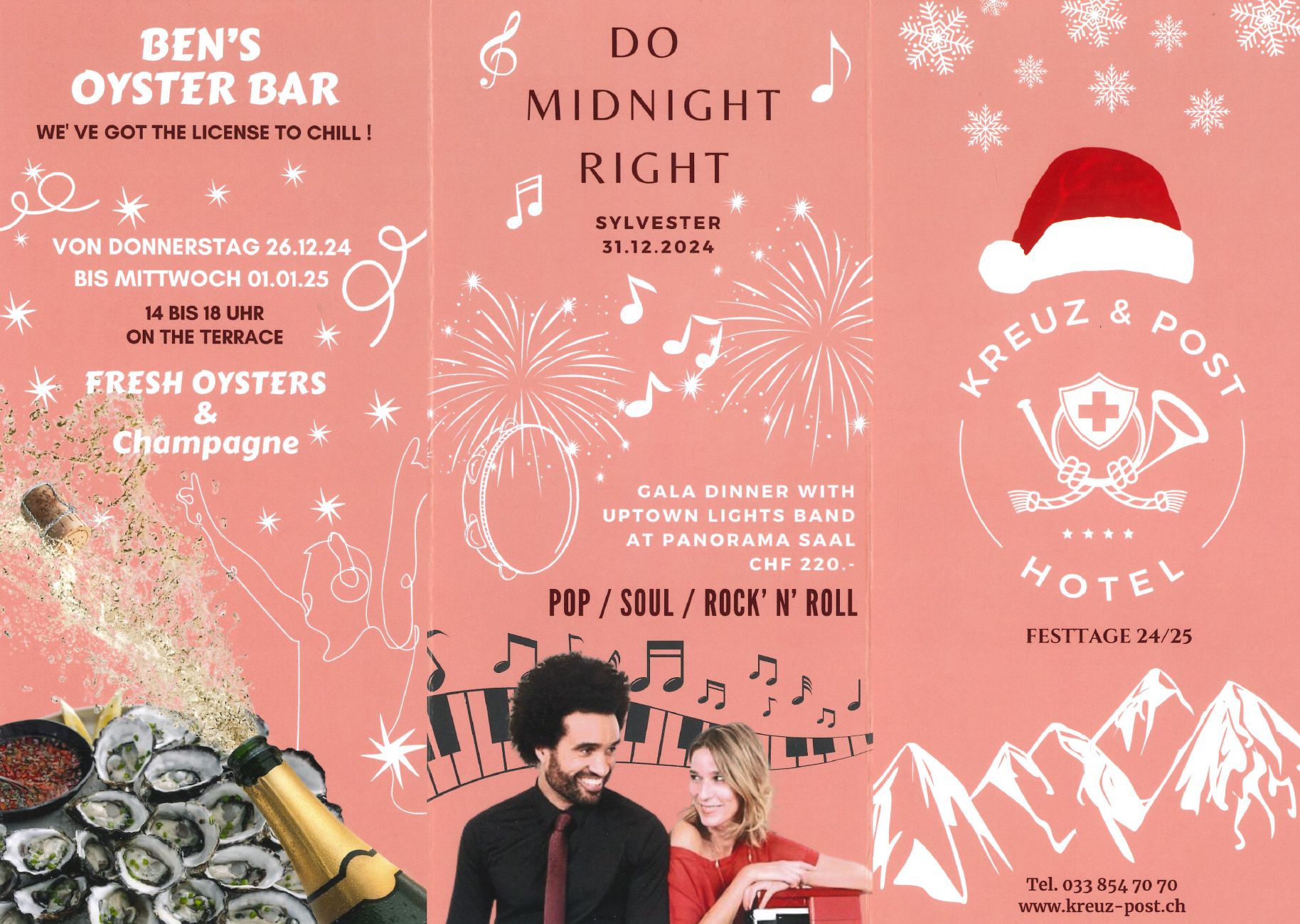 Begrüssen Sie das neue Jahr mit Eleganz und Rhythmus bei unserem Gala-Dinner mit der Uptown Lights Band im Panoramarestaurant – eine Feier voller Geschmack, Musik und alpinem Charme.