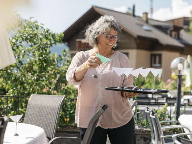 Der helle Raum mit grossen Fensterflächen oder im Sommer die schöne Sonnenterasse schaffen eine offene Atmosphäre mit Blick auf die Bergwelt und die Jungfrau. Klassische Schweizer Küche trifft hier auf moderne Einflüsse und feine internationale Akzente.