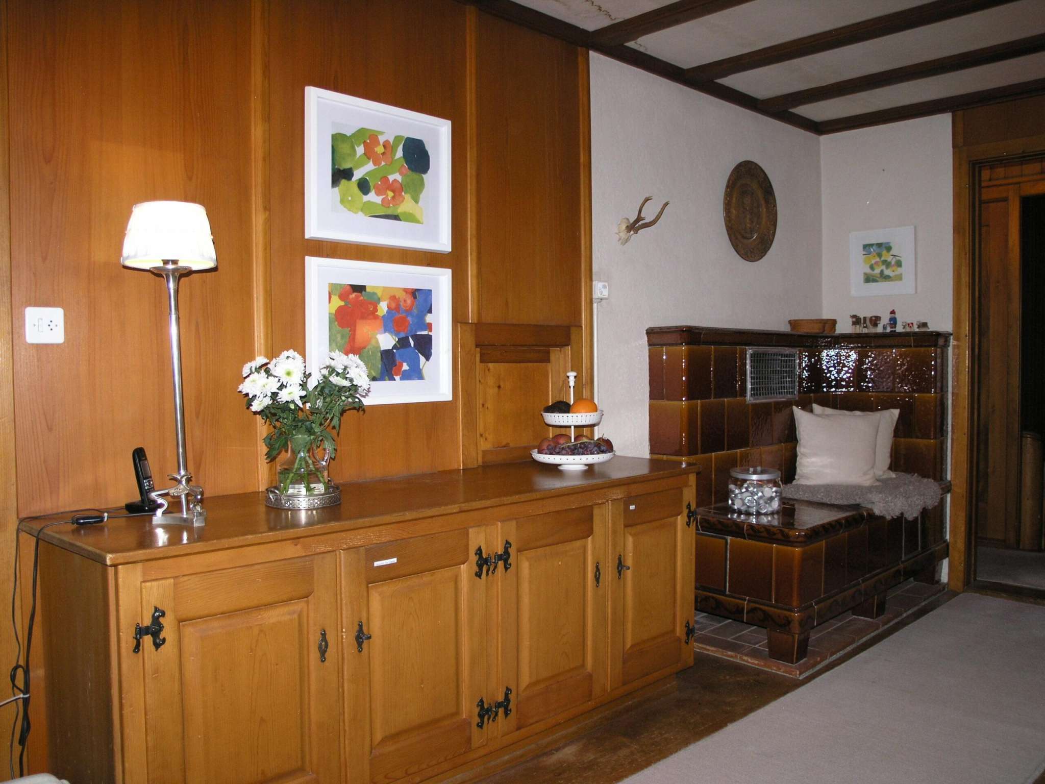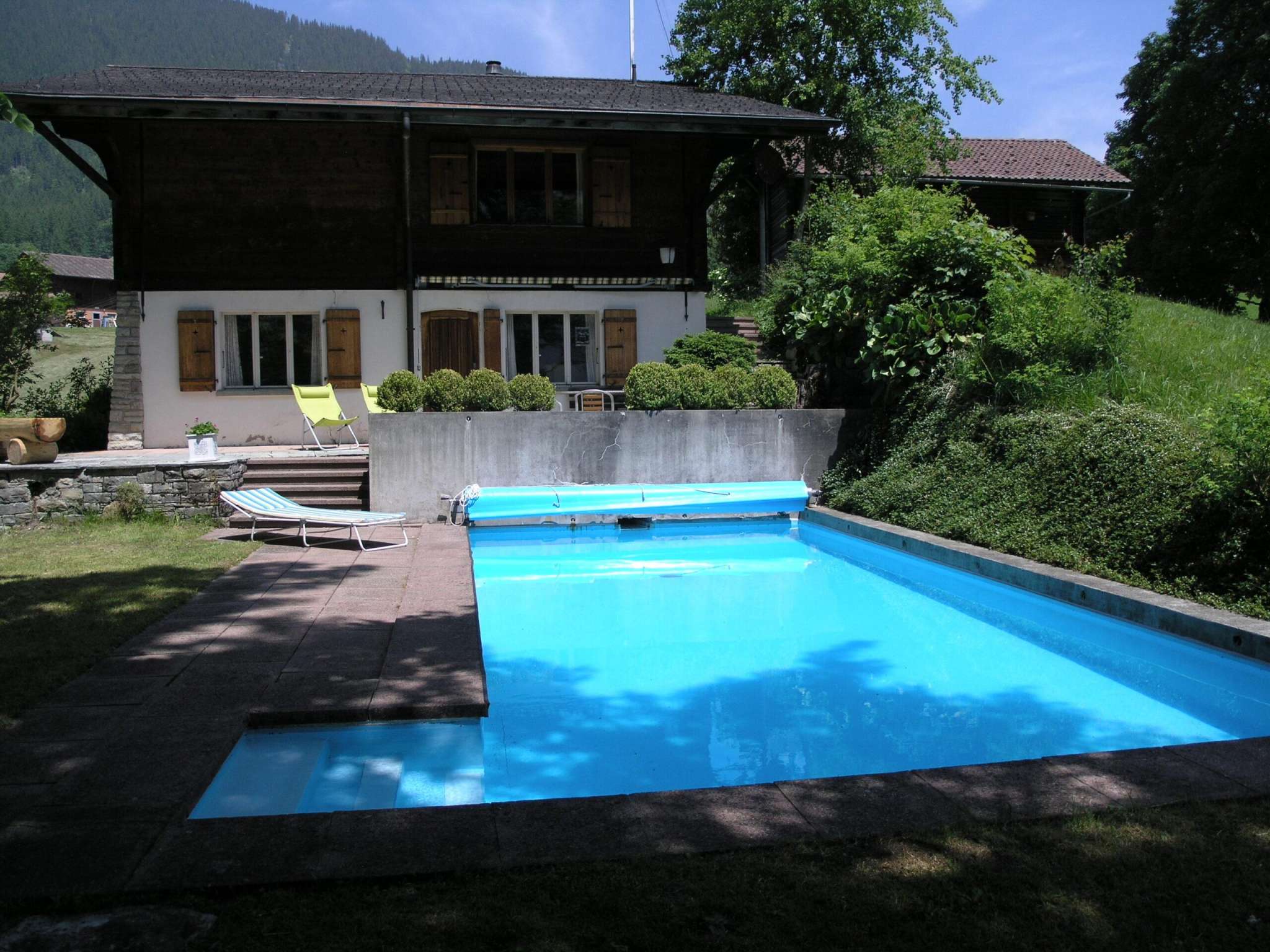 Im Sommer: grosser privater Garten mit Sitzplatz, 8,5 x 4m Aussen-Pool zur Alleinbenützung (in Betrieb: 7.6.-13.9., beheizt 21-23C, mit Kindersicherungs-Abdeckung, Sand-Filter-Anlage, Bade-Tücher), Liegewiese, Gartenpavillon, Garten-Mobiliar, alter Baumbestand, Holz-Brunnen (Trinkwasser), grosser Sitzplatz mit Esstisch und Holz-Eckbank.