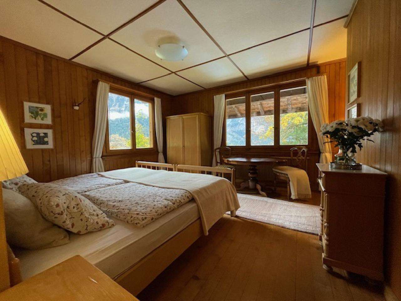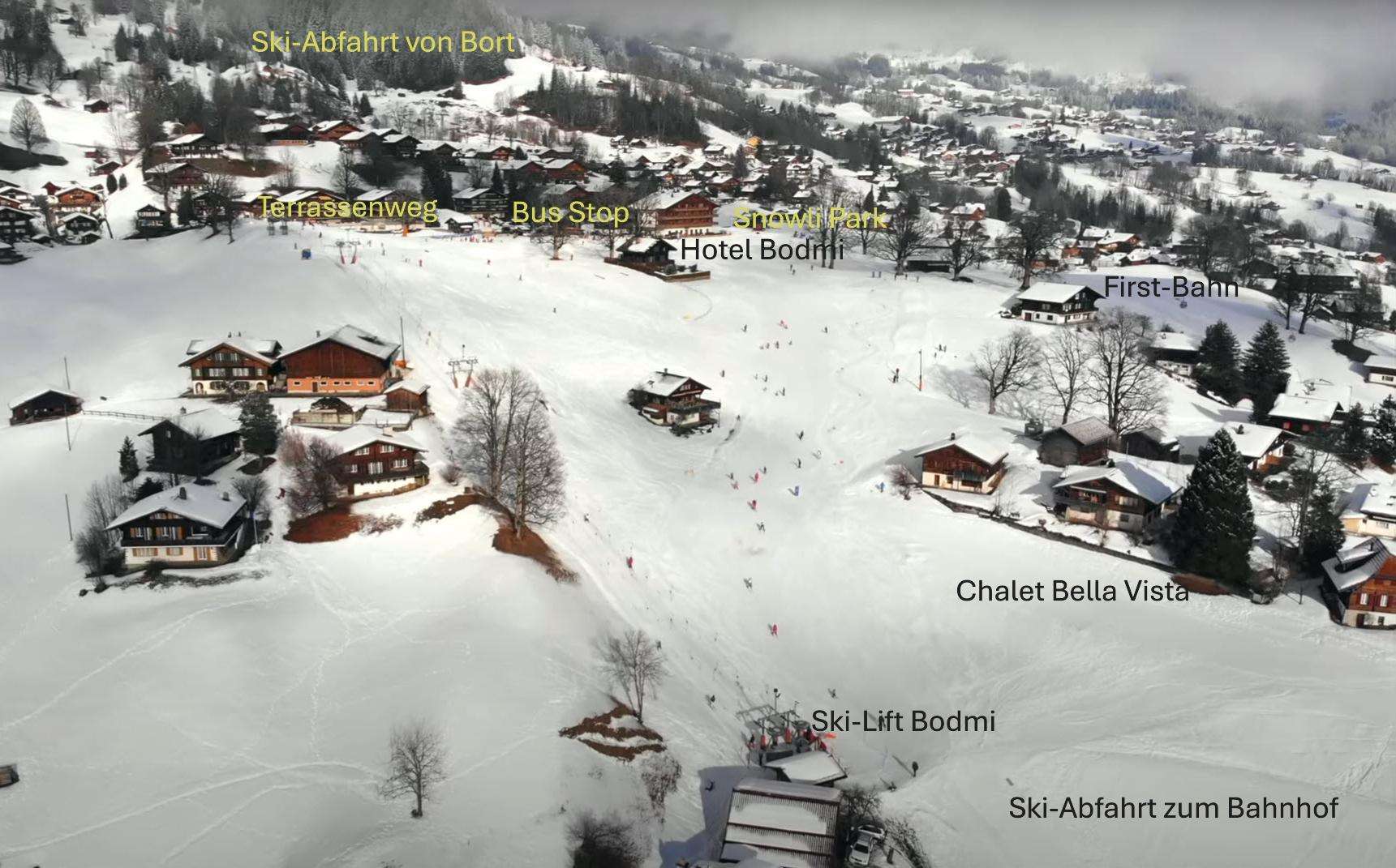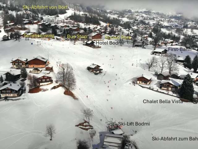 Im Winter: einzigartige Lage mitten im beschneiten Übungsgelände der offiziellen Grindelwald-Ski-Schule! Ski-in Ski-out. Übungs-Lift 70m vor dem Chalet. Vom Chalet-Balkon aus beobachten Sie Ihre Kinder beim Üben. Für ganz kleine Kinder liegt in 200m Entfernung die Bodmi-Arena mit professioneller Kinder-Wintersport-Betreuung. Per Ski erreichen Sie in wenigen Minuten sowohl Grindelwald-Bahnhof (Bahn nach Kleine Scheidegg) und die Talstation der First-Bahn – also die beiden grossen Ski-Gebiete Grindelwalds. Ihr Auto parken Sie in einem der grossen öffentlichen Parkhäuser – Sie werden es während Ihrem Aufenthalt nicht brauchen. Stress-freie Bahn-Anreise wird empfohlen (Gepäckaufgabe). Die Benützung des sehr guten Ski-Bus-Netzes in Grindelwald ist inbegriffen.