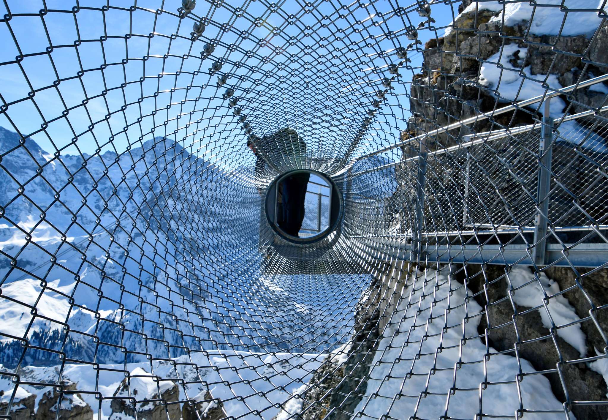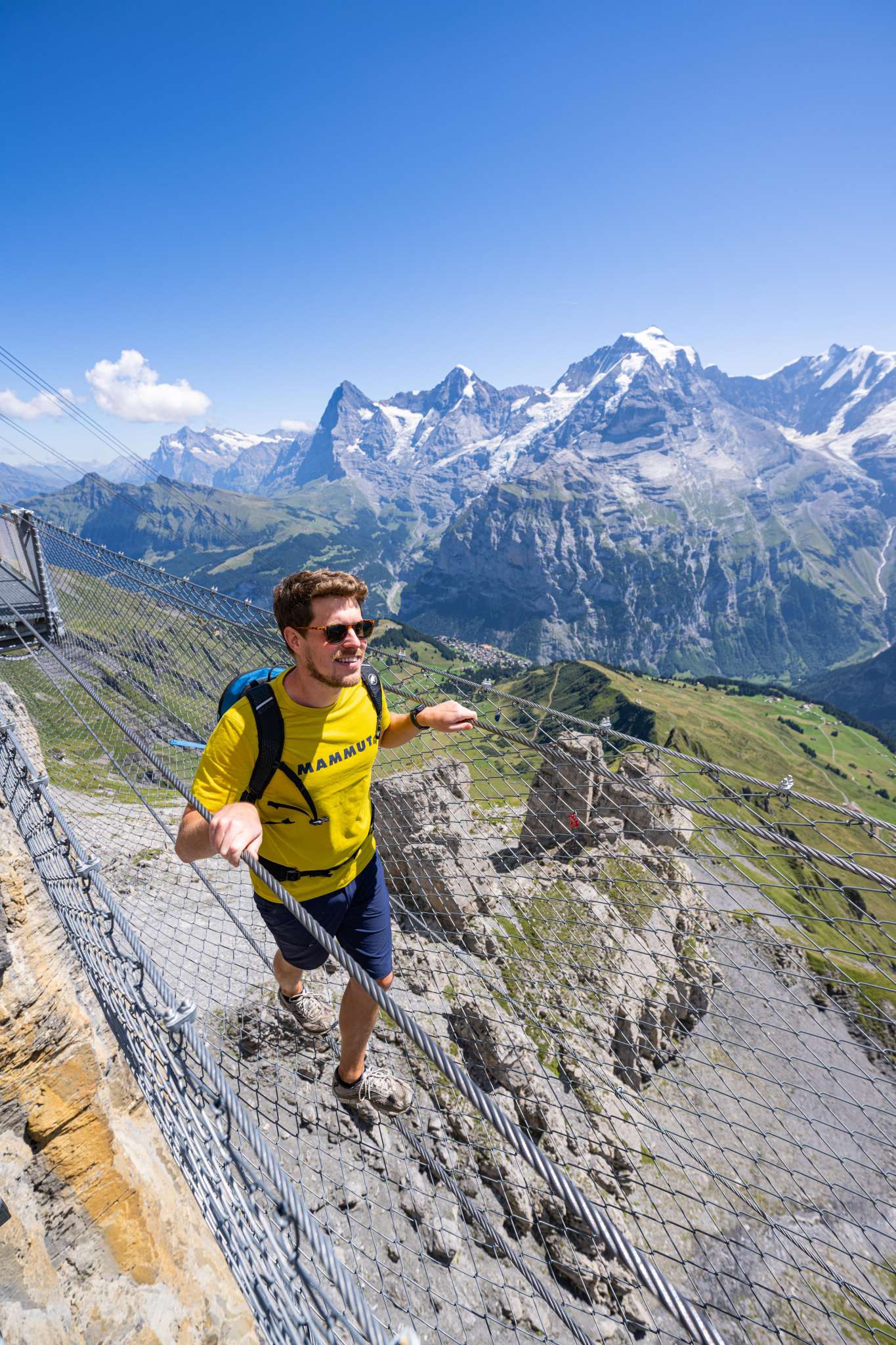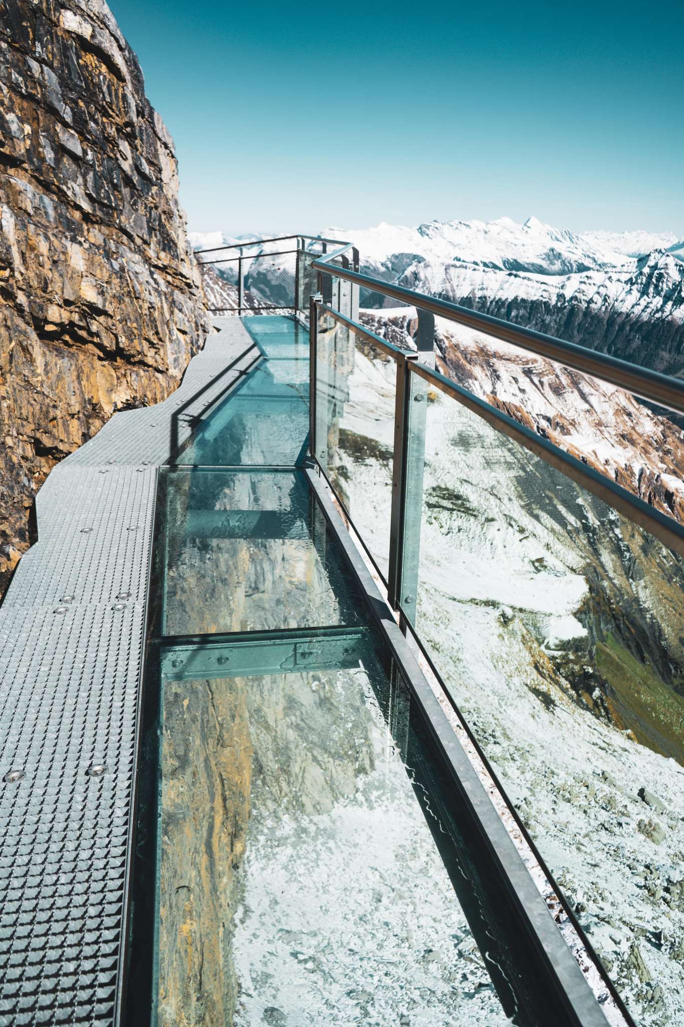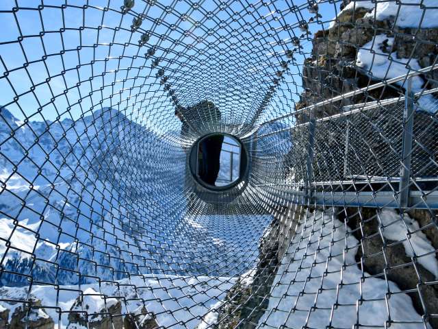 Wer sich von Mürren her auf den Weg Richtung Schilthorn macht, kommt nach der ersten Gondelfahrt bei der Mittelstation Birg an. Hier solltest du einen längeren Halt einplanen, um den Thrill Walk zu besuchen. Er garantiert allen, die es wagen ihn zu überschreiten, einen höheren Puls. Der rund 200 Meter lange Felsensteg wurde entlang des senkrechten Abgrunds in den Fels gebaut. Die Konstruktion aus Stahl und Glas sowie einem Boden aus Gitterrosten, fügt sich nahtlos in die kantige Felslandschaft ein. Für den Besuch des Thrill Walks solltest du etwa 45 Minuten einplanen, damit du auch noch genügend Zeit hast hast, ein paar spektakuläre Fotos zu schiessen. Neben dem Gitterrost, aus dem der Steg und die Treppe grösstenteils bestehen, gibt es rund 20 Meter Glasboden, Viehrostboden-Elemente und eine neun Meter lange Seilbrücke samt Sicherheitsnetz. Ein acht Meter langer Kriechtunnel vervollständigt das Erlebnis. Der Einstieg zum Thrill Walk befindet sich auf der Seite der Panoramaterrasse der Station Birg. Nach den 200 Metern voller Nervenkitzel erreichst du das weiter unten liegende Ende des Stegs. Von dort führt ein Schotterweg (im Winter schneebedeckt) hinauf zum Stationsgebäude.