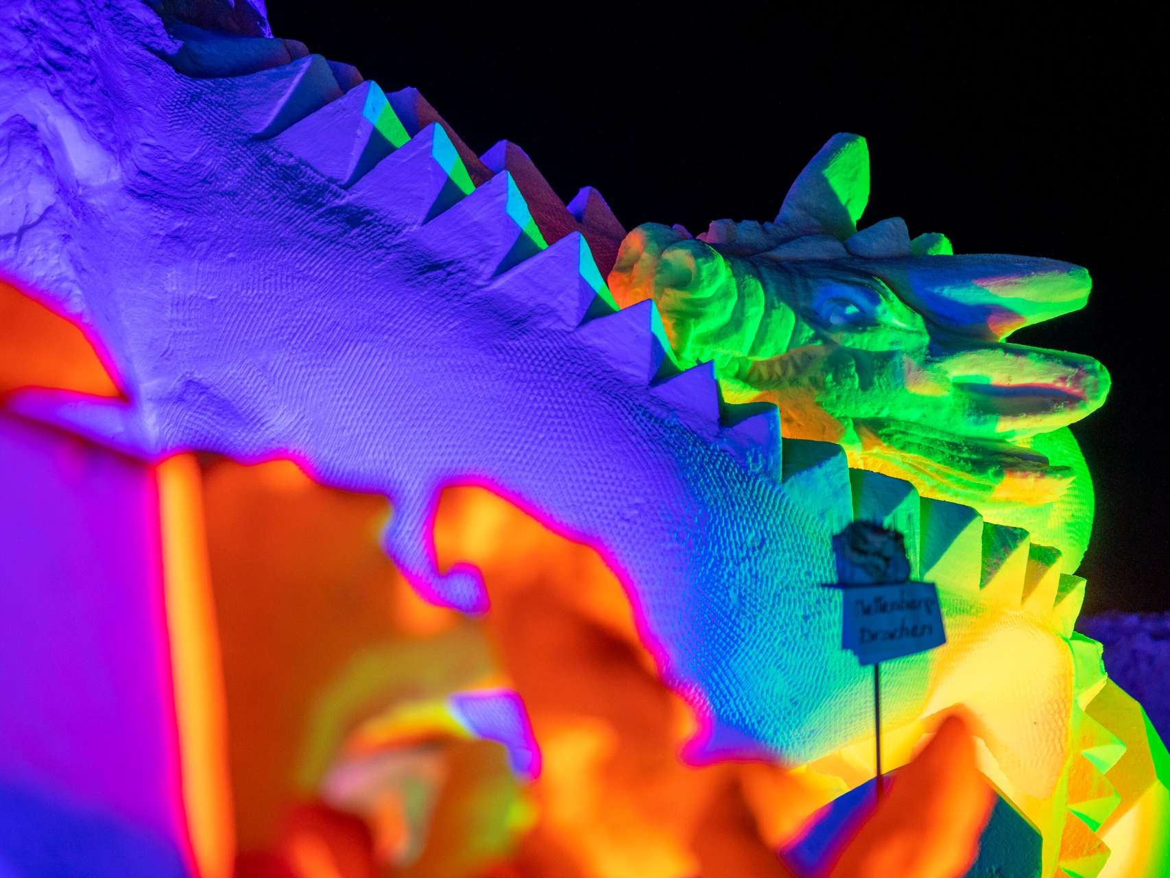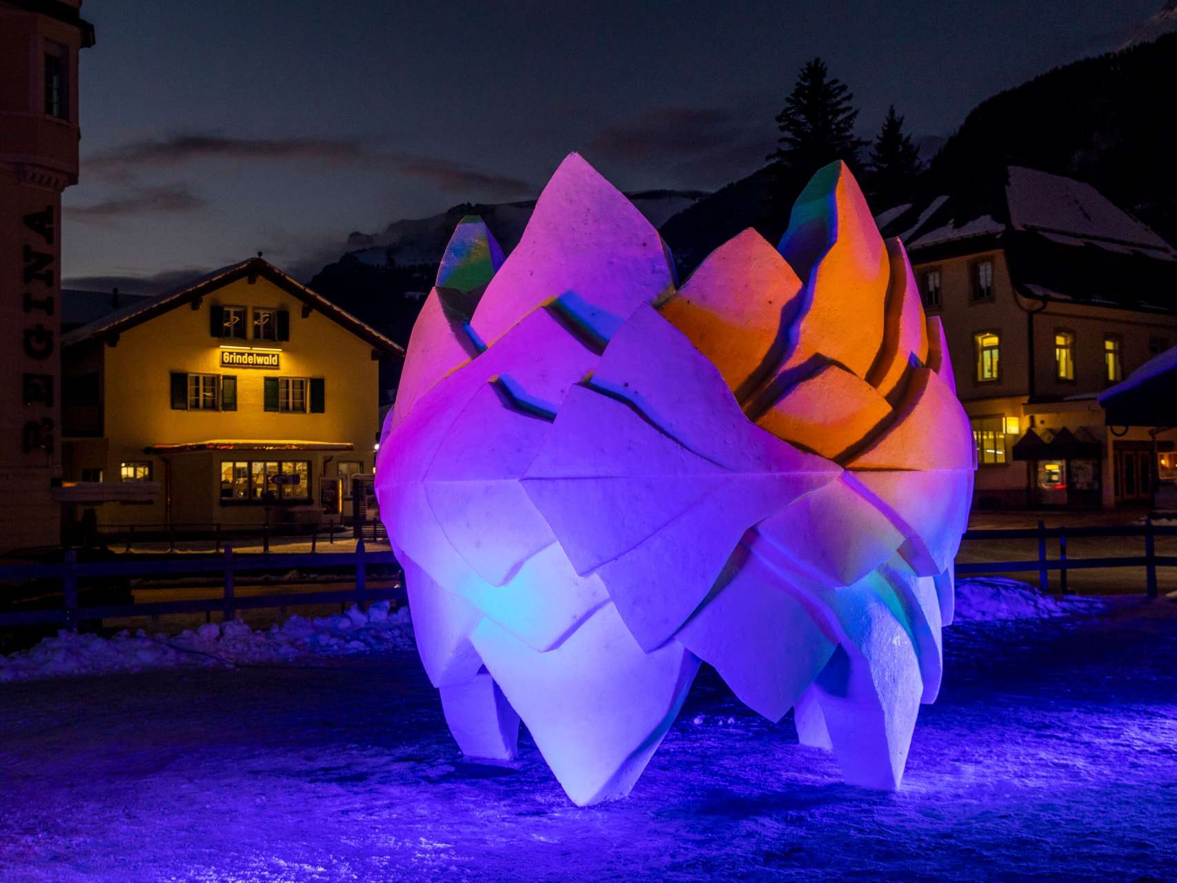 Mein Arbeitstag neigt sich dem Ende. Kurz vor Einbruch der Dunkelheit verlasse ich das Büro. Mittlerweile sind die Kunstwerke fertig. Es ist Tradition, dass diese an den letzten beiden Abenden des «World Snow Festivals» beleuchtet sind. Die Künstler*innen haben ihrer Fantasie freien laufen gelassen. Ich bin begeistert von den Ergebnissen. Ja, die Arbeit der letzten Wochen und Monaten hat sich definitiv gelohnt.