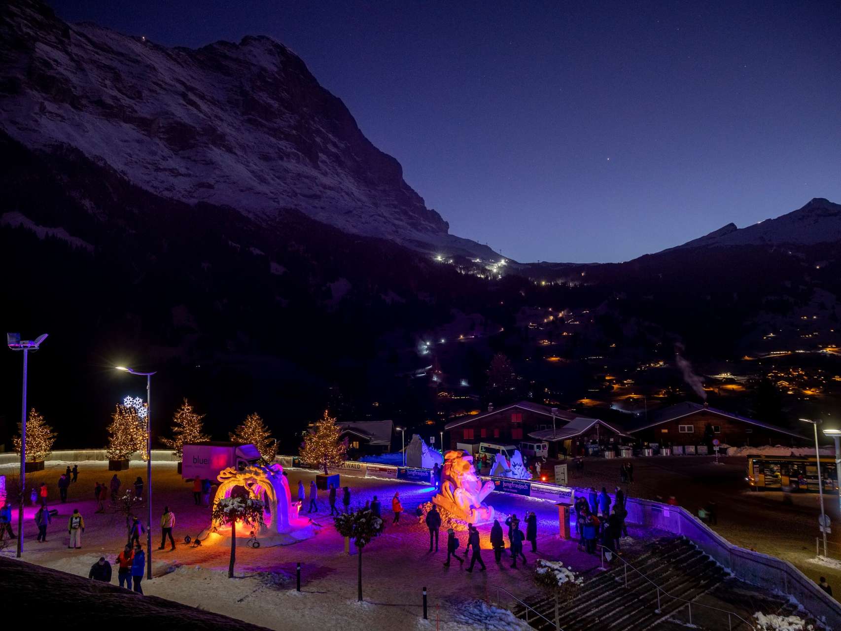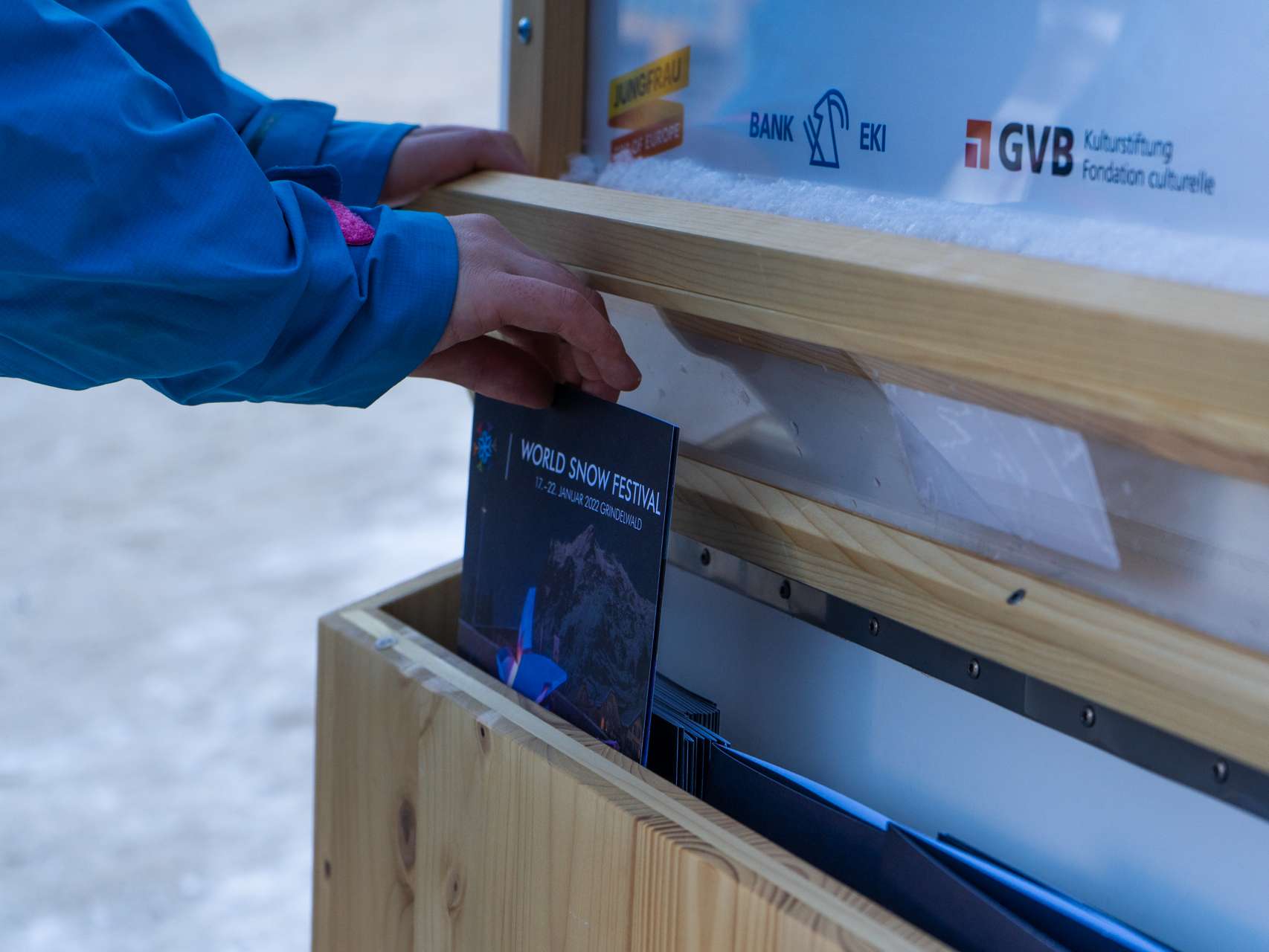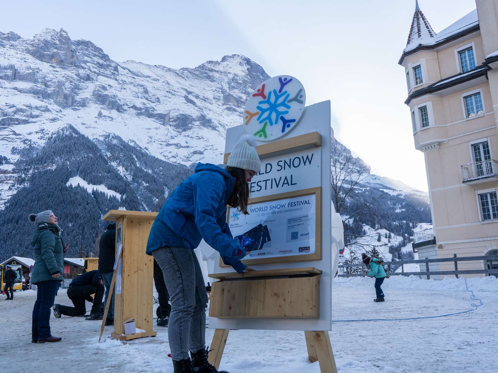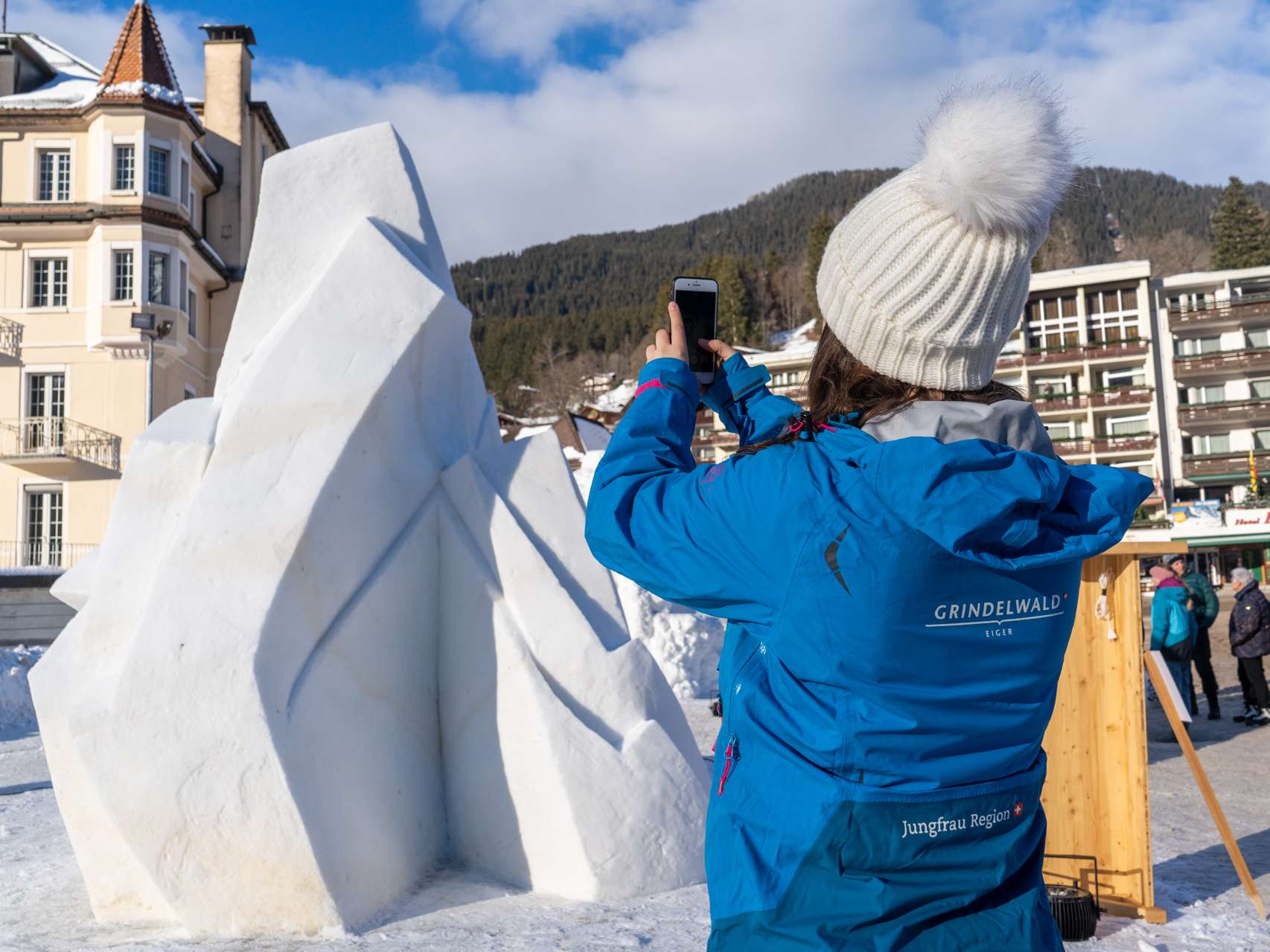 Mittagspause. Mittlerweile herrscht reges Treiben im Dorf. Die Künstler*innen sind am Feinschliff. Die Zuschauer*innen fasziniert. Die fast fertigen Werke sind beliebte Fotosujets. Überall auf den Strassen von Grindelwald sehe ich Plakate des «World Snow Festivals». Bei diesen, wie auch bei den grossen Bannern am Dorfeingang und beim Bahnhof habe ich mitgeholfen.