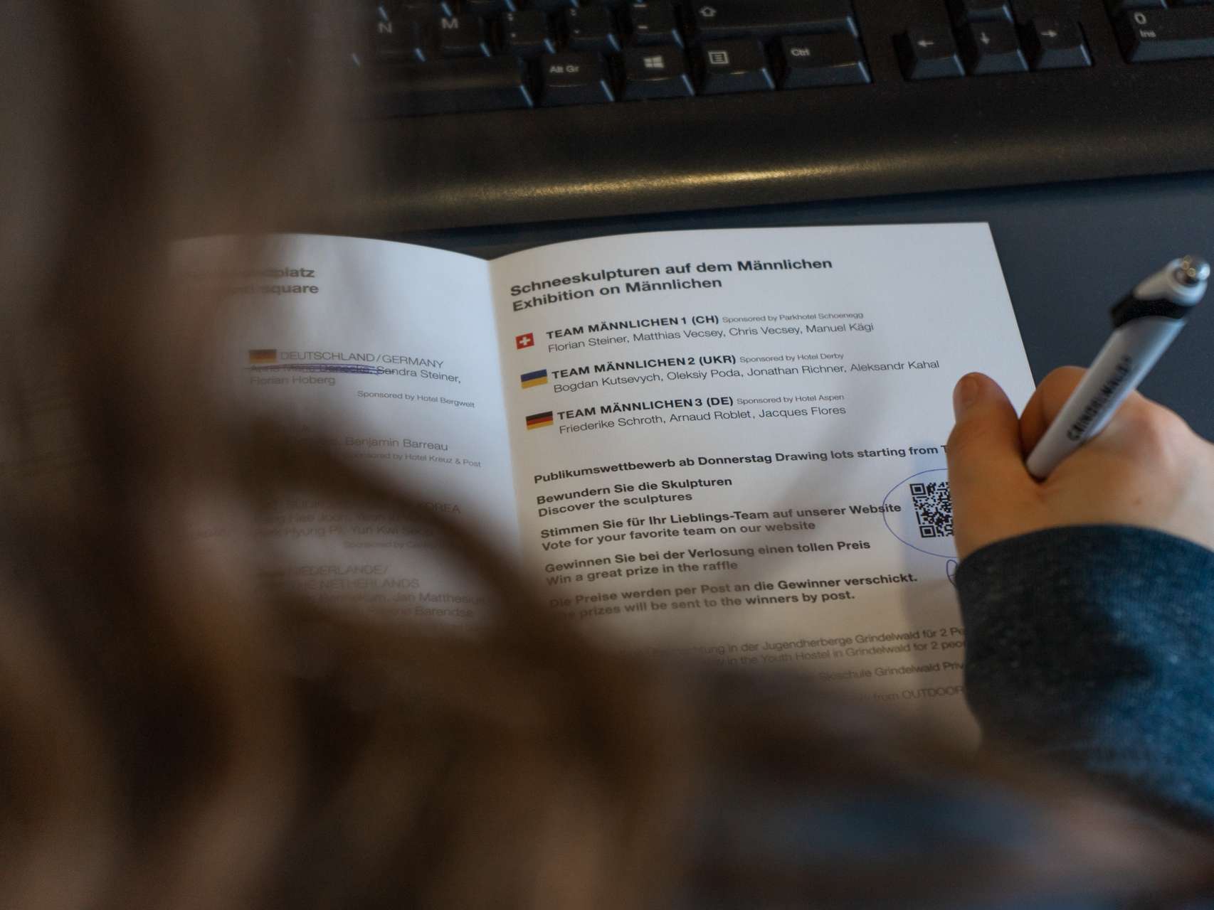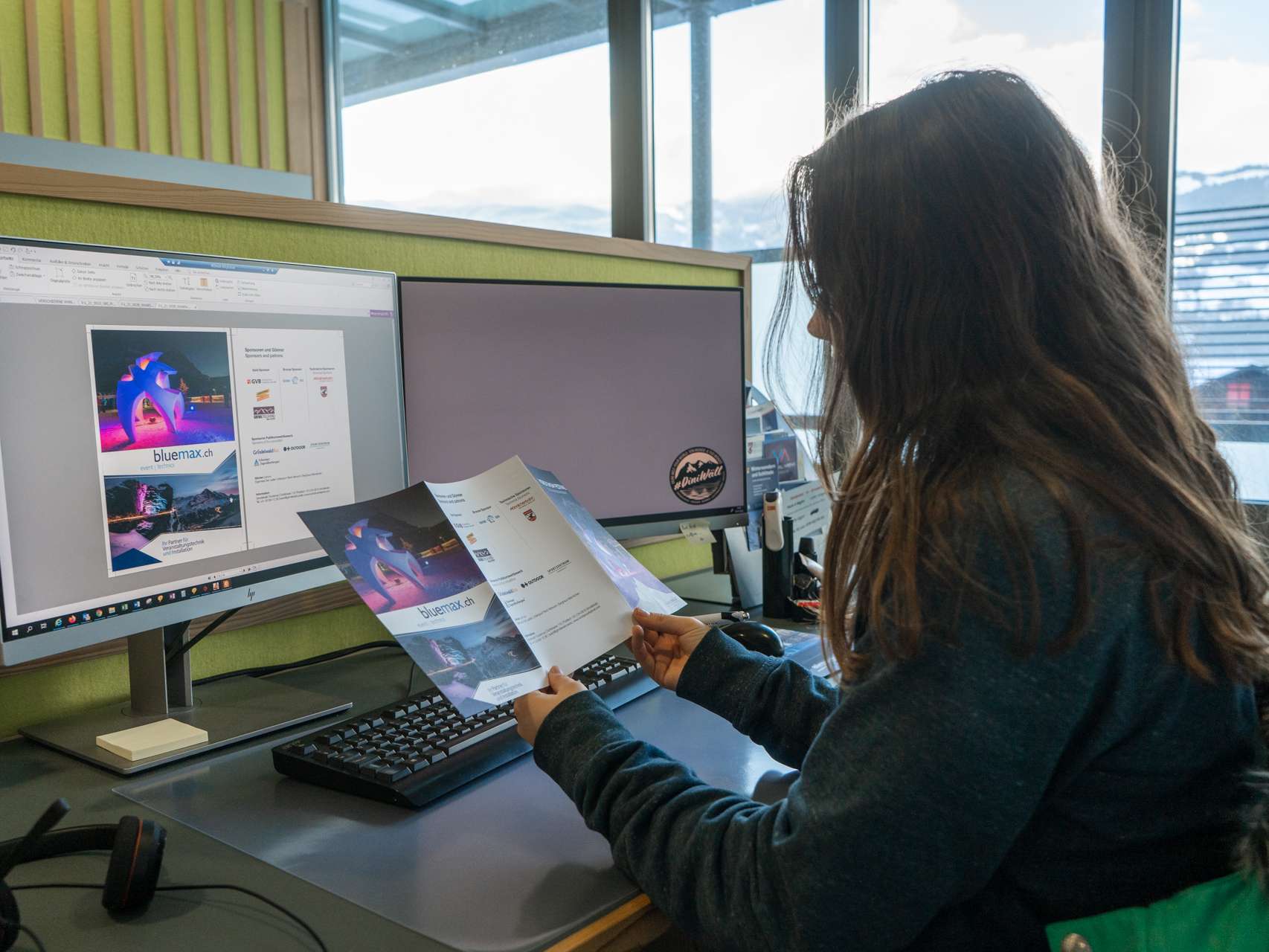 Fast an meinem Arbeitsplatz angekommen, fällt mir ein Stapel Prospekte auf. Es sind Flyer, die das «World Snow Festival» anpreisen. Während der Planung dieses Events, wie auch schon bei anderen vorher, war ich bei der Entstehung des Flyers involviert. Das gehört zu meiner Arbeit in der Abteilung Produktmanagement. Während drei Monaten meiner Ausbildung durfte ich hier hinter die Kulissen der Grindelwalder Events blicken. Ich konnte nicht nur bei der Planung mithelfen, sondern auch die Events persönlich besuchen und vor Ort tatkräftig mithelfen. Doch zurück zu den Flyern. Diese werden vor dem Event an die örtlichen Hotels, Gäste und Geschäfte weitergegeben, entsprechend müssen sie gestaltet sein. Manchmal dauert es eine Weile, bis ein Flyer wie gewünscht aussieht. In solchen Fällen arbeite ich eng mit dem Grafikteam in Interlaken – dem Hauptsitz der Jungfrau Region Tourismus AG – zusammen, welches die Flyer designt.