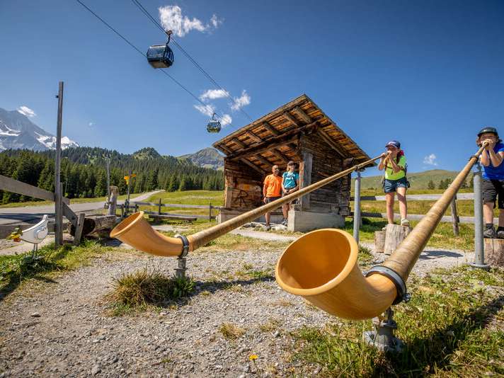 For families in Grindelwald, the numerous themed trails offer an ideal opportunity to explore the diversity of our mountain region in a special way. Combine exercise with entertainment and experience an exciting excursion into nature. On the Lieselotteweg, the Öpfelchüechliweg, the Challiflohtrail or the marmot trail, there is plenty for the little ones to discover.