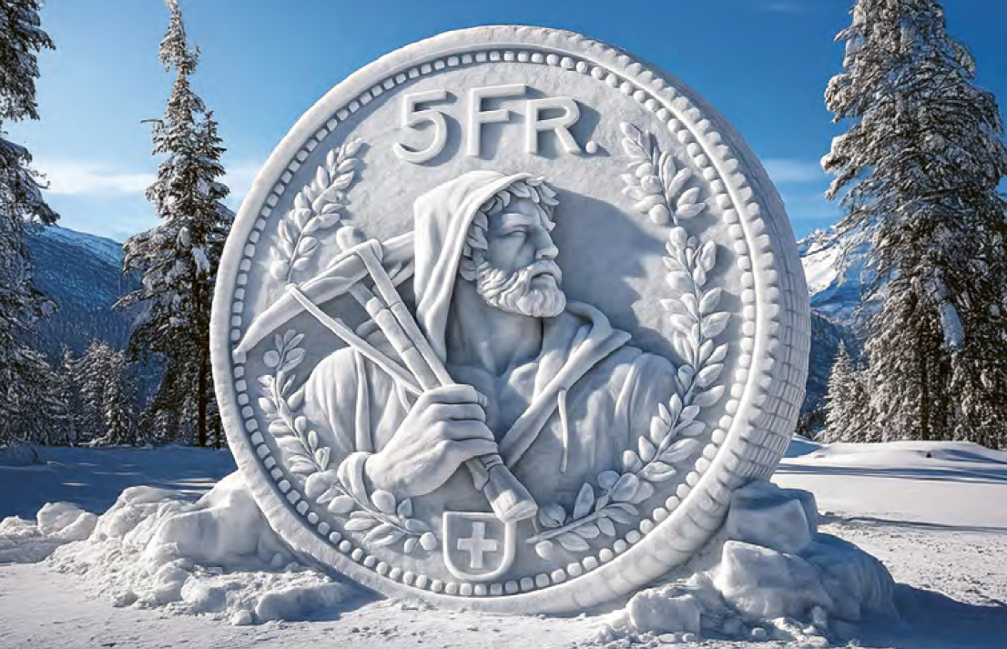 The giant «five-franc coin» depicts a male figure reminiscent of William Tell or an Alpine herdsman. It stands for strength, responsibility, and the protection of the community, linking wellknown national stories with ancient myths from the Alpine region. The currency itself also becomes a myth here: its value does not come from the material it is made of, but from people's shared belief in it. We accept this value because we trust it. This creates a connection between legend and money - both exist through shared ideas and trust.