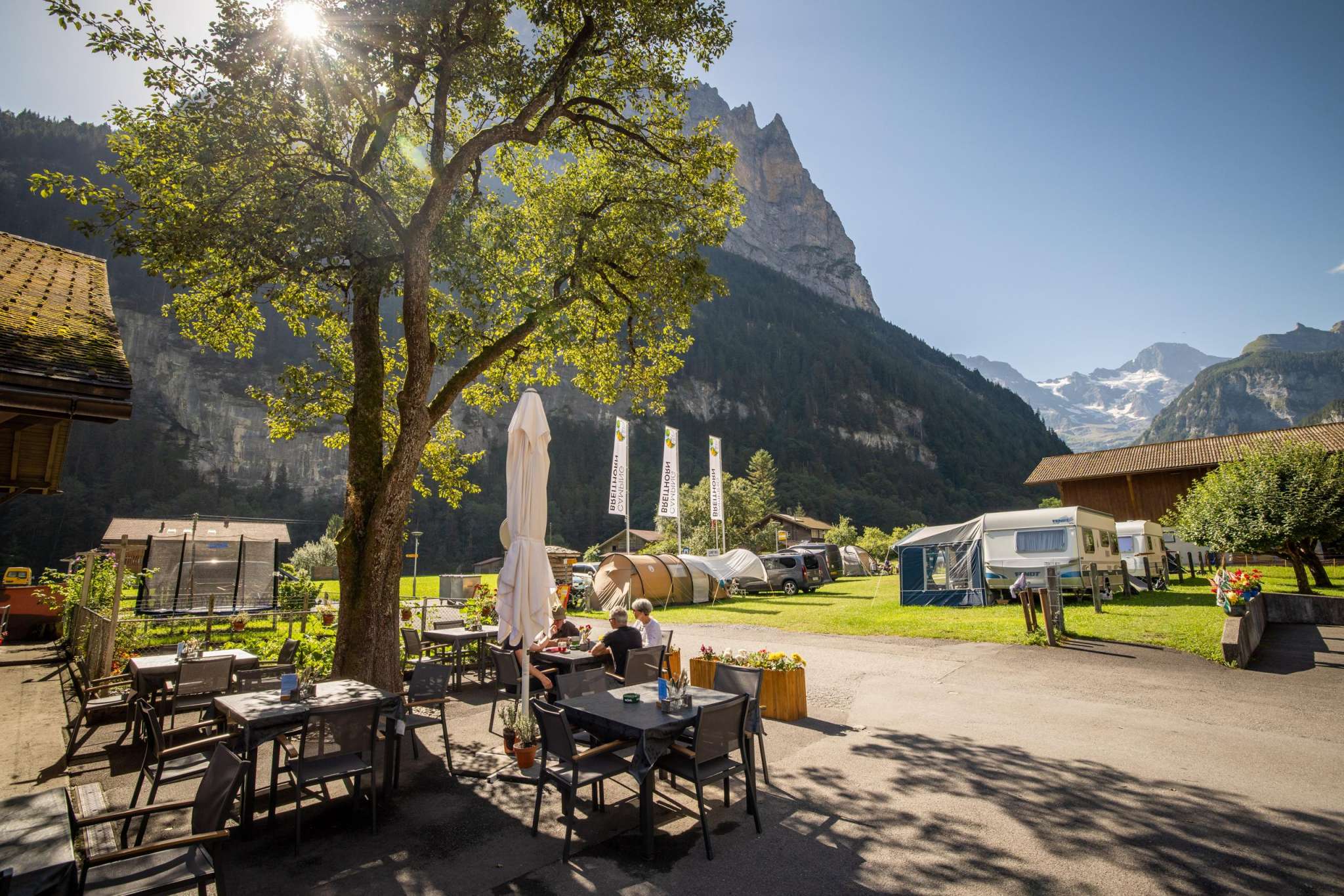 Our campsite is ideally situated right next to the bus route and is the perfect starting point for unforgettable adventures. In just a few minutes, you can reach the Schilthornbahn, which takes you to the idyllic mountain villages of Gimmelwald and Mürren. From there, spectacular hikes and the ride up to the legendary Piz Gloria await – the revolving restaurant offering a breathtaking 360° panoramic view of the Alps.