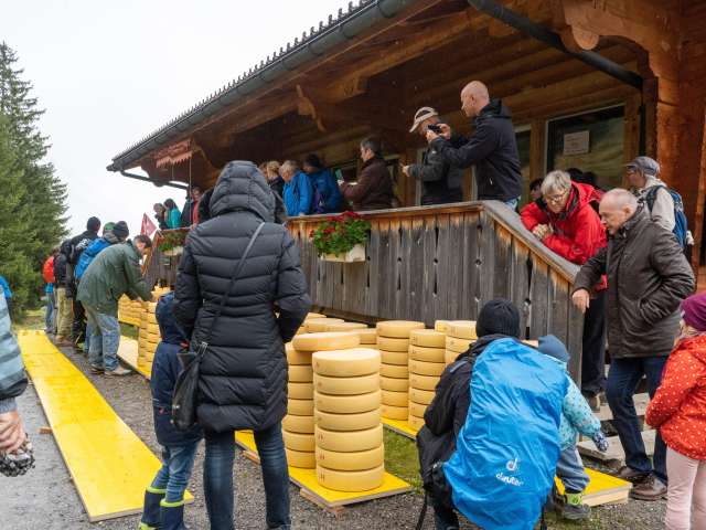 The cheese produced on the alp during the summer will be distributed to the farmers who have brought their cows to the alp for the summer. With folk music entertainment and sales stand with the alp products.