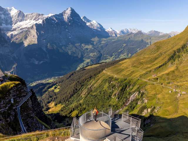 A short walk leads from the First mountain station to the slightly higher metal building in the shape of a windmill. After the entrance, each of the seven “rotor blades”, which are offset in height, focuses on a particular section of the Alpine ring: from the highest peaks of the Bernese Oberland to the world-famous Eiger North Face and the skiing and hiking mountains around Grindelwald. Various seating options invite you to linger and marvel. Those in search of a little thrill will find it next door on the First Cliff Walk by Tissot or on the two Flying Fox variants, the First Flyer and First Glider.