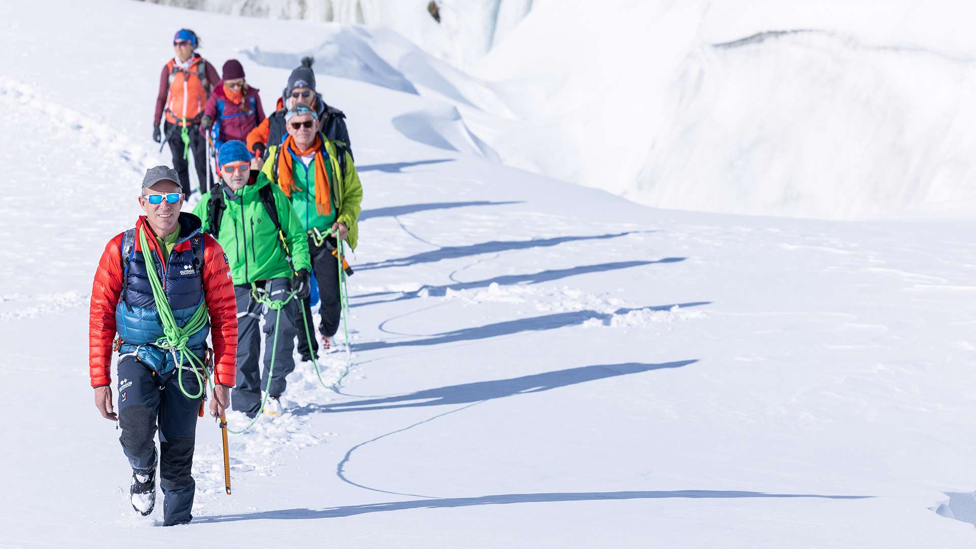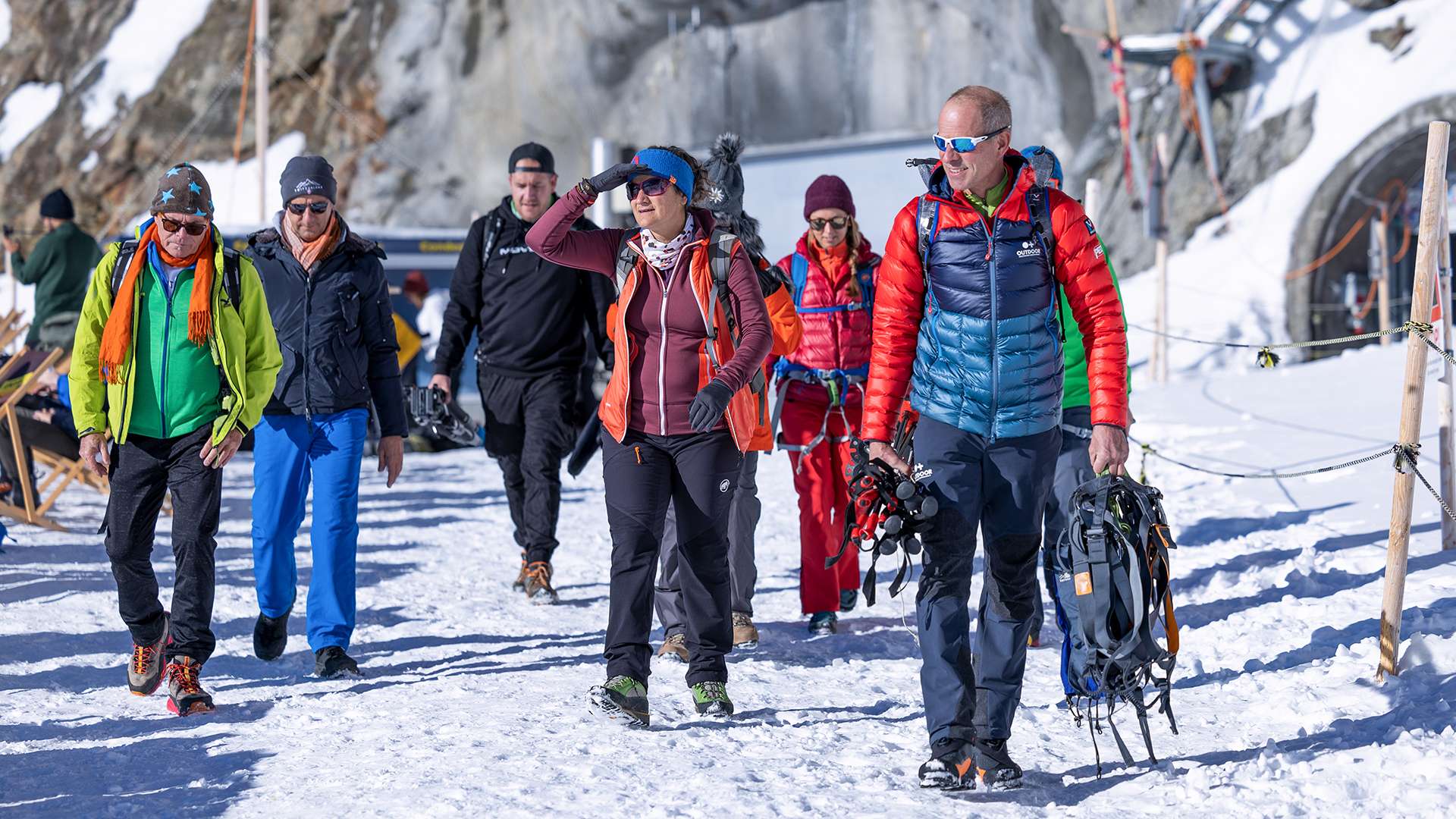 For this special adventure, we will pick you up at the meeting point and then continue on to the Jungfraujoch at 3,454 meters above sea level – the highest railway station in Europe! After roping up and putting on our helmets, our IVBV mountain guides will skillfully guide you across the glacier, ski pole in hand. They look forward to sharing their wealth of experience and general knowledge of the mountainous topography and specific mountaineering expertise throughout the day. The distance and pace of the glacier tour can be adjusted to the specific goals and abilities of your group.