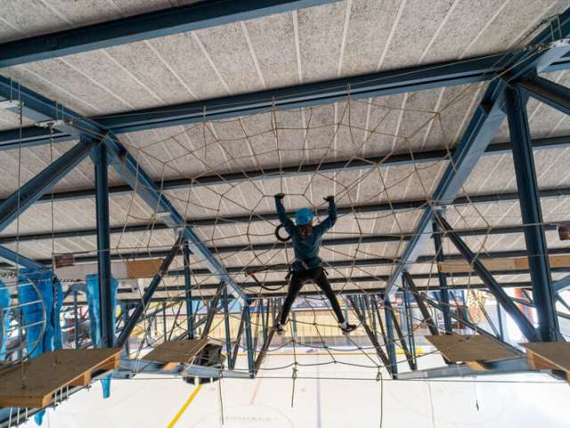 From the easy "Eiger Westgrat" to the difficult "Eiger north face", five routes in Switzerland's first indoor rope park provide adventure at lofty heights. Under the roof of the ice rink, you can balance, climb or fly over sometimes wobbly, sometimes original elements. After a competent introduction by the staff, the rope park can be explored individually.
