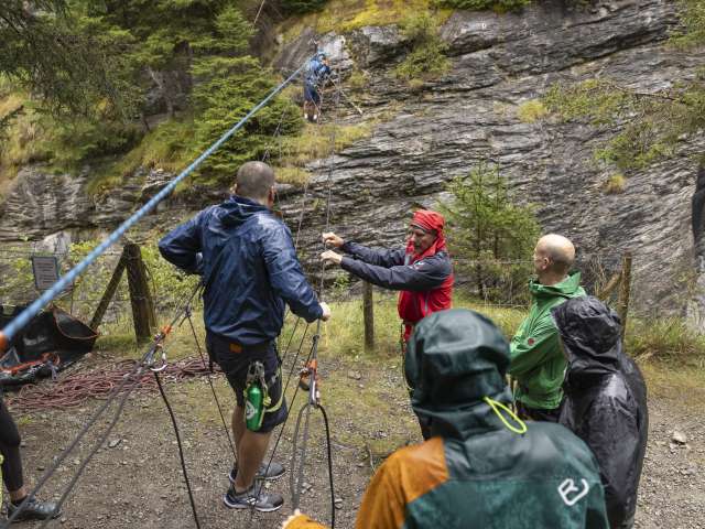 Your OUTDOOR guides will be happy to tell you about the geological history of the glacier gorge as well as its economic importance for the tourism industry in the Jungfrau region. Still not satisfied and hungry for even more mountain adventures? Have you long been tempted by the idea of scaling a vertical rock face? A good way follow up the bridge-building activity, especially for larger groups, is an introduction to rock climbing or the thrill of abseiling down the rock face of the glacial gorge. Adding this activity to the schedule makes it possible to avoid longer wait times since we can complete your activities in two separate groups at the same time. For the “Climbing and Abseiling” package, you will receive expert guidance from the people at OUTDOOR.