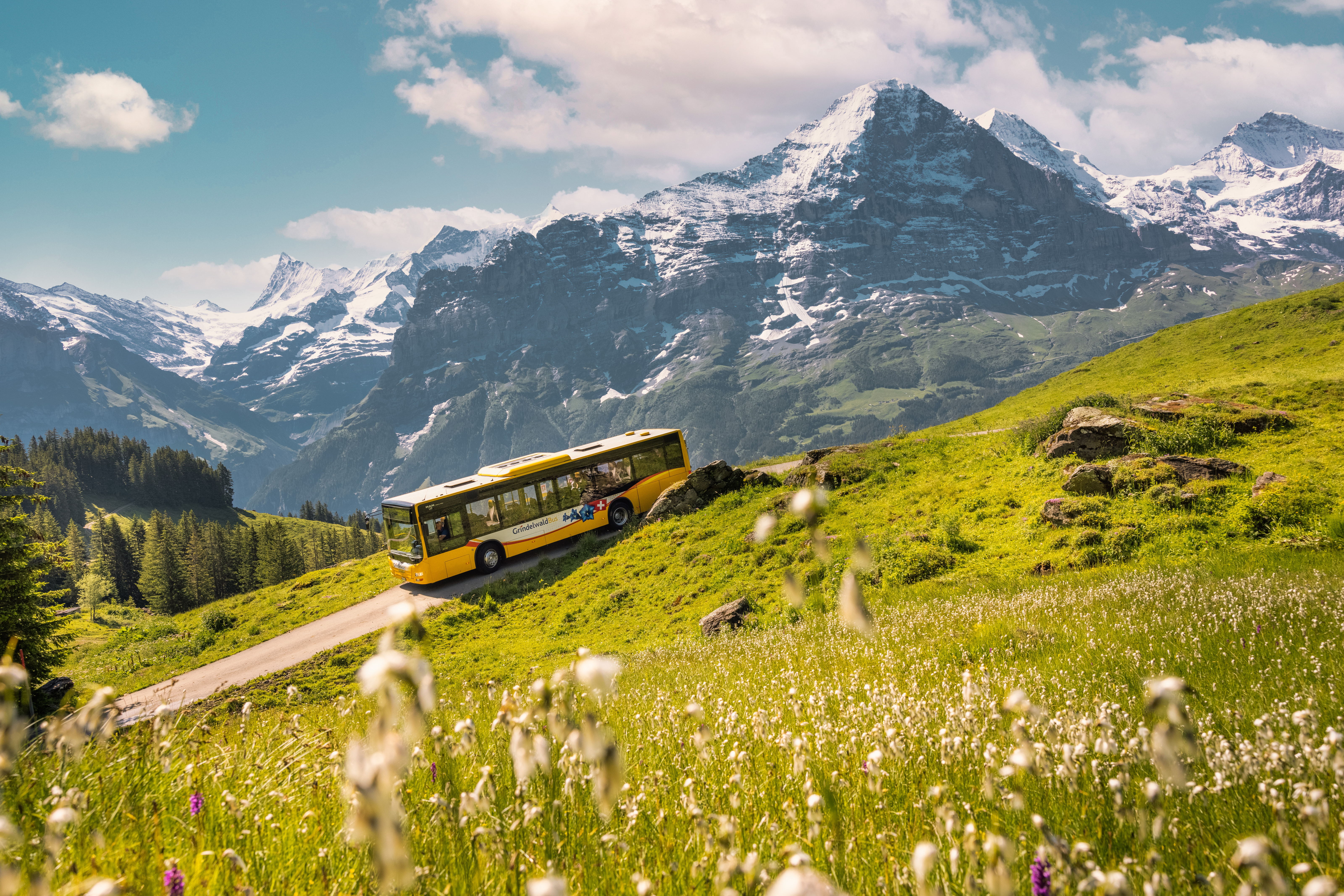 Let Grindelwald Bus take you on unforgettable mountain journeys through charming Alpine meadows and wildly romantic mountain landscapes, or to the foot of the majestic Wetterhorn. The buses can also take you to the Bussalp sun terrace and viewing platform, to the idyllic Waldspitz with its magnificent mountain scenery or over the Grosse Scheidegg.