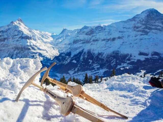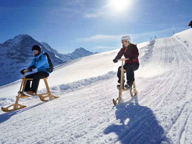 Couronne ton séjour à Grindelwald par une descente nocturne en luge après une délicieuse fondue au fromage au restaurant alpin Bussalp. (Réservation indispensable ; la piste n'est pas éclairée).