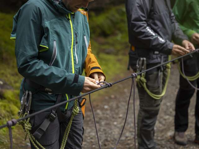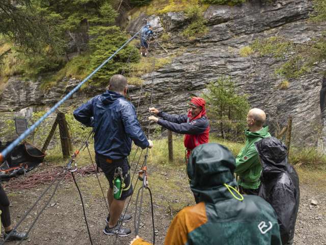 Tu n'as pas encore assez d'aventures en montagne? Cela fait longtemps que tu es tenté de traverser une paroi rocheuse à la verticale? En complément de la construction d'un pont de cordes, il est possible, surtout pour les grands groupes, de s'initier à l'escalade sur rocher ou de faire une impressionnante descente en rappel sur la paroi rocheuse de la gorge du glacier. Ce point supplémentaire du programme nous permet d'éviter des temps d'attente plus longs en doublant notre programme pour vous. Pour l'offre "escalade et descente en rappel", tu seras guidé et encadré de manière compétente par des guides de montagne d'OUTDOOR.