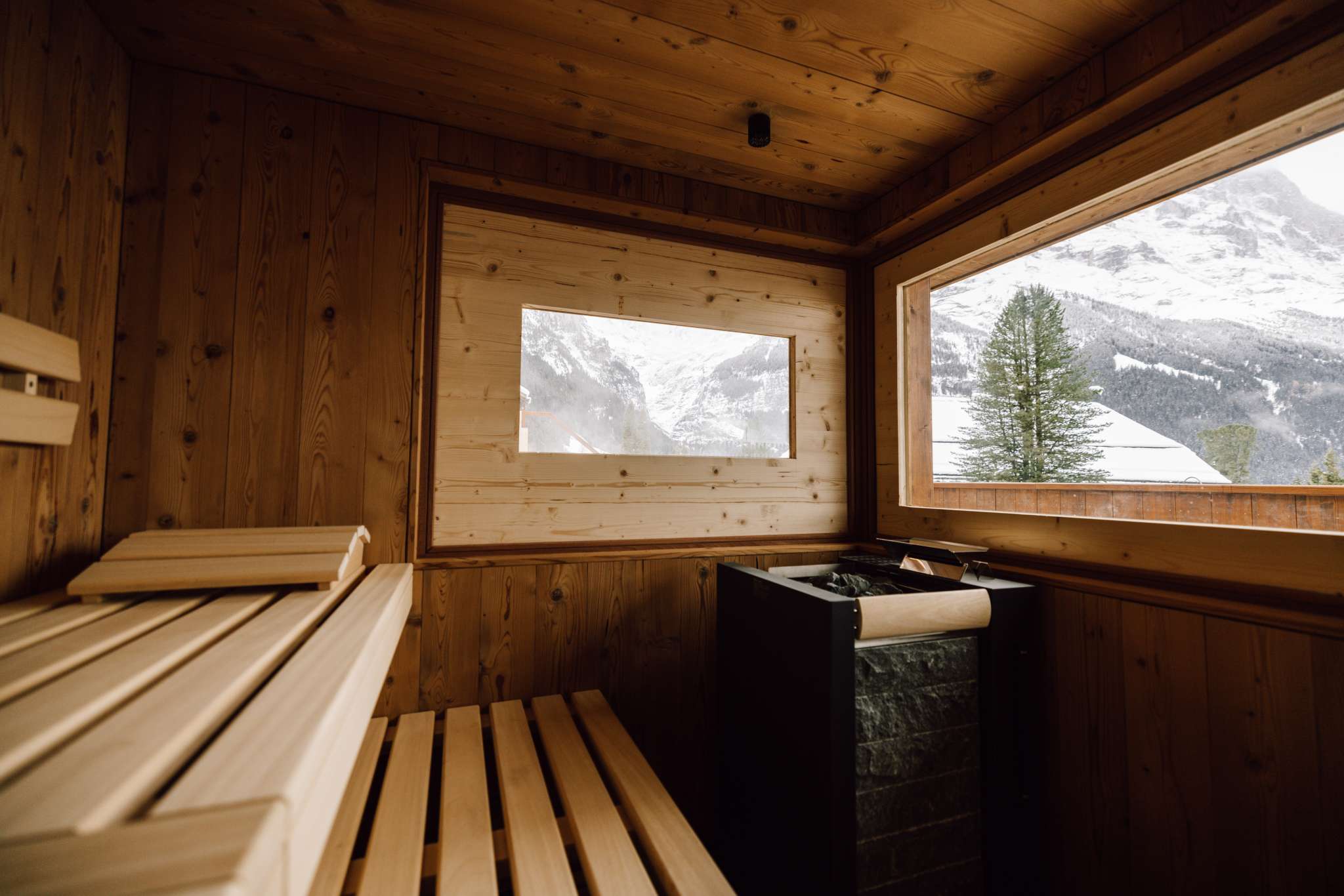 Sauna finlandais avec fenêtres panoramiques sur l'Eiger et le Fiescherhorn et le glacier
