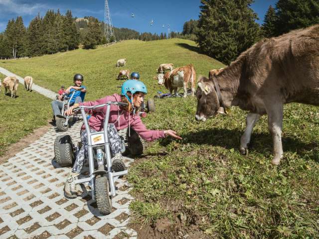 Le Mountain Cart, un mélange de kart et de luge, convient aux enfants mesurant au moins 135 cm. Des casques de protection sont mis gratuitement à disposition.