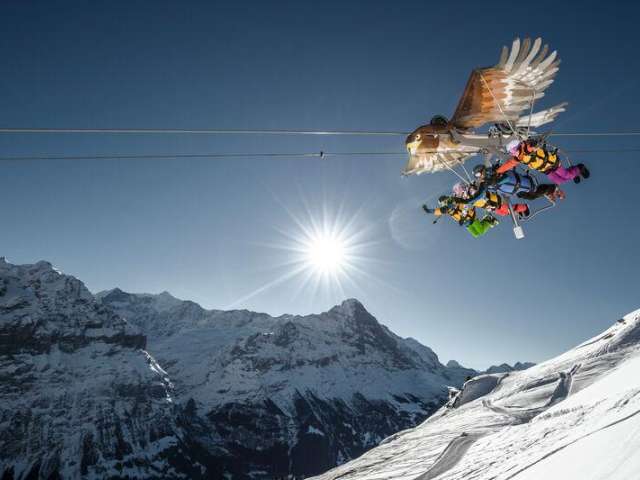Voler comme un rapace peut être une expérience inoubliable. L’aigle appelé First Glider emmène quatre passagers pour un vol spectaculaire au-dessus des montagnes. Il est d’abord tiré en arrière de Schreckfeld à First à 72 km/h. Au retour, l’aigle « décolle » réellement et dévale les 800 mètres du trajet aérien à une vitesse pouvant atteindre 83 km/h. Âge minimum : 10 ans, taille minimum : 130 cm.
