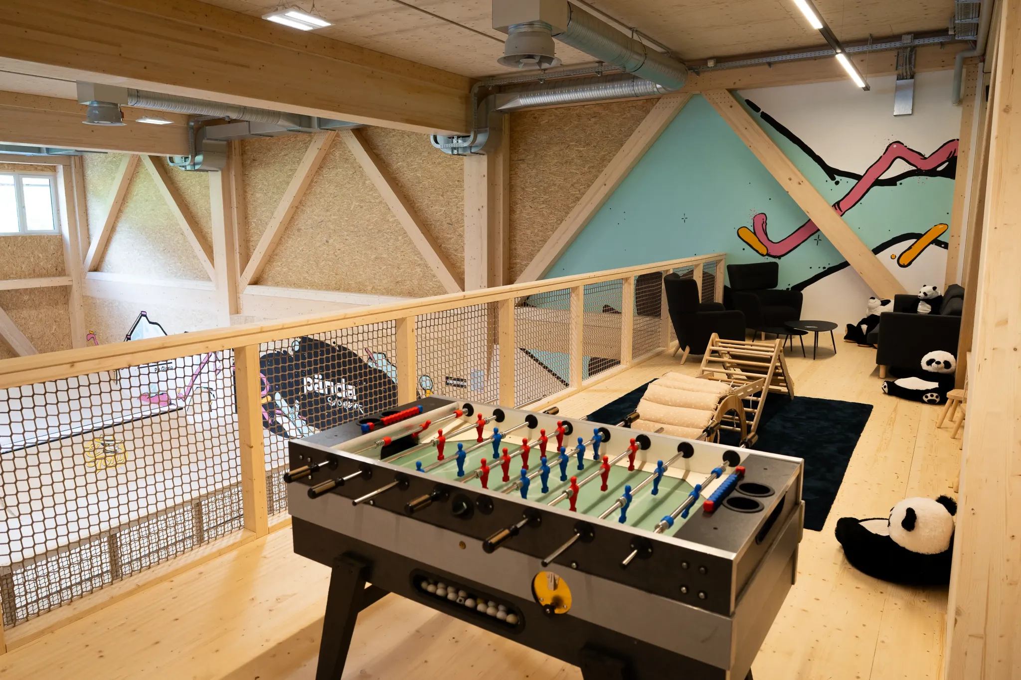Outre les zones de trampoline et de glisse, un espace multisport doux est parfait pour le yoga, les ateliers, le parkour ou les mouvements libres. Depuis la galerie, les spectateurs bénéficient d’une vue complète sur la halle, accompagnée d’un coin bistrot pour se détendre. Les enfants s’amusent pendant que les parents peuvent se relaxer à portée de vue. Toute la famille y trouve son compte.
