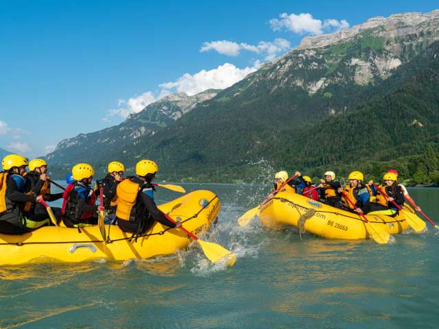 Une descente en rafting sur la Lütschine pour toute la famille ! Sur la partie inférieure, la rivière présente certes de petites vagues, mais plus vraiment d'eaux vives, ce qui rend cette excursion sûre pour les plus petits. Bien équipés, vous pagayerez sous la supervision d'un guide professionnel en direction du lac de Brienz. Là, les eaux turquoise vous invitent à plonger dans la fraîcheur !